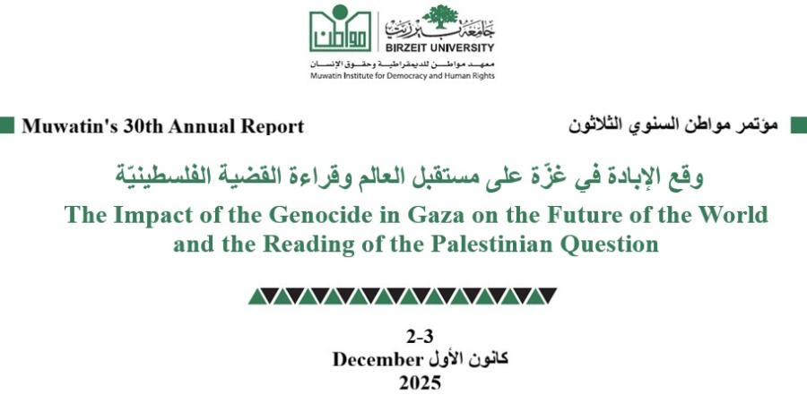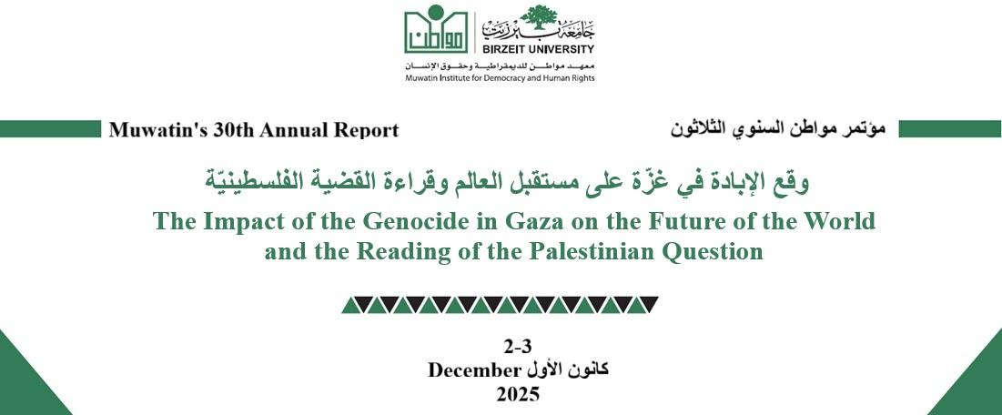 The conference will be held on Tuesday and Wednesday, 2 and 3 December 2025, in a hybrid setting at Birzeit University on campus in Hall 243 at Muwatin Institute, and online at the same time. The conference will be broadcasted live on the Muwatin Institute channel on YouTube and through the Institute’s Facebook page, as well as the possibility of participation via Zoom, which requires previous registration by clicking here.