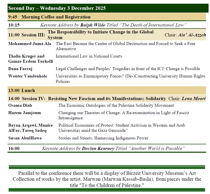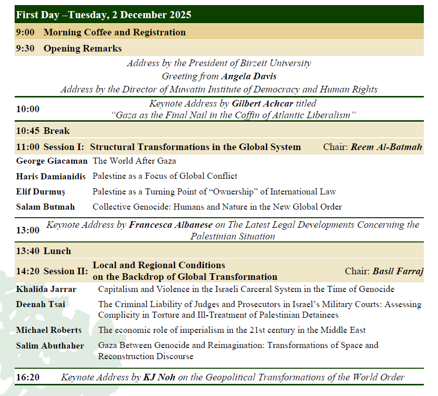 The conference will be held on Tuesday and Wednesday, 2 and 3 December 2025, in a hybrid setting at Birzeit University on campus in Hall 243 at Muwatin Institute, and online at the same time. The conference will be broadcasted live on the Muwatin Institute channel on YouTube and through the Institute’s Facebook page, as well as the possibility of participation via Zoom, which requires previous registration by clicking here.